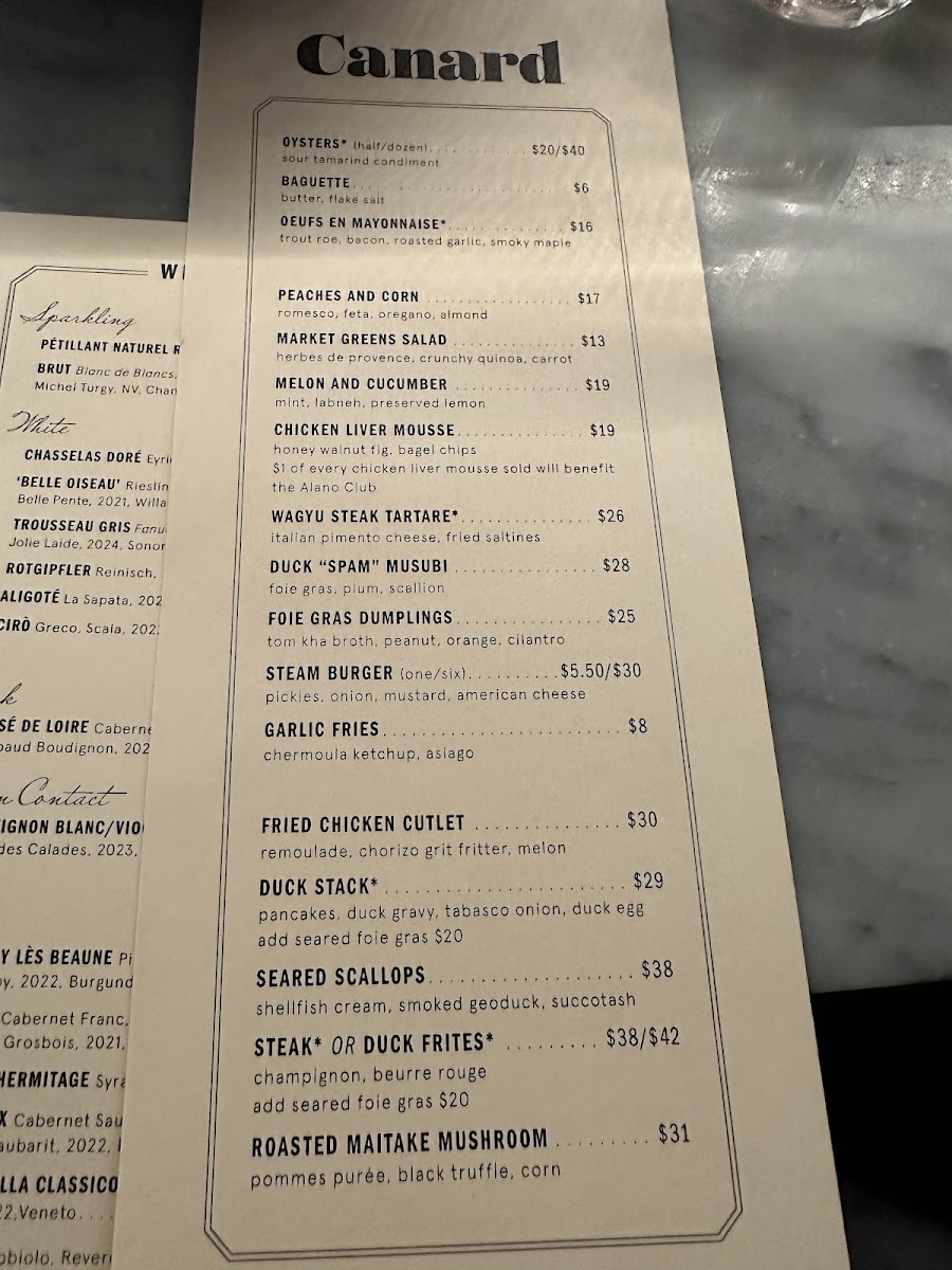At Canard, you’ll find everything from perfectly crisp duck dishes to late-night bites that feel both nostalgic and elevated. One minute you’re eyeing foie gras-topped burgers, the next you’re tempted by delicate pasta or a plate of steak frites done just right. Even the smaller plates feel thoughtful, layered with texture and flavor. It’s the kind of menu that invites you to share a few things with the table-though you might regret it once you taste your first bite.